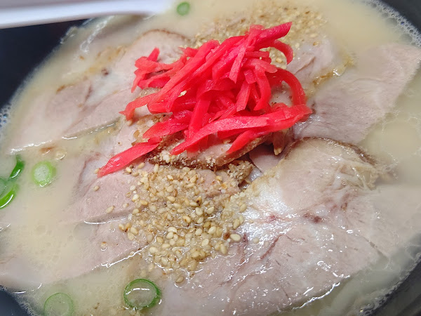 さてラーメンですが、博多とんこつに似るもややあっさりの長浜ラーメン、一口目はそのままガフガフとすすり、その後紅生姜で好みに整えながら食べることができ美味しいです。