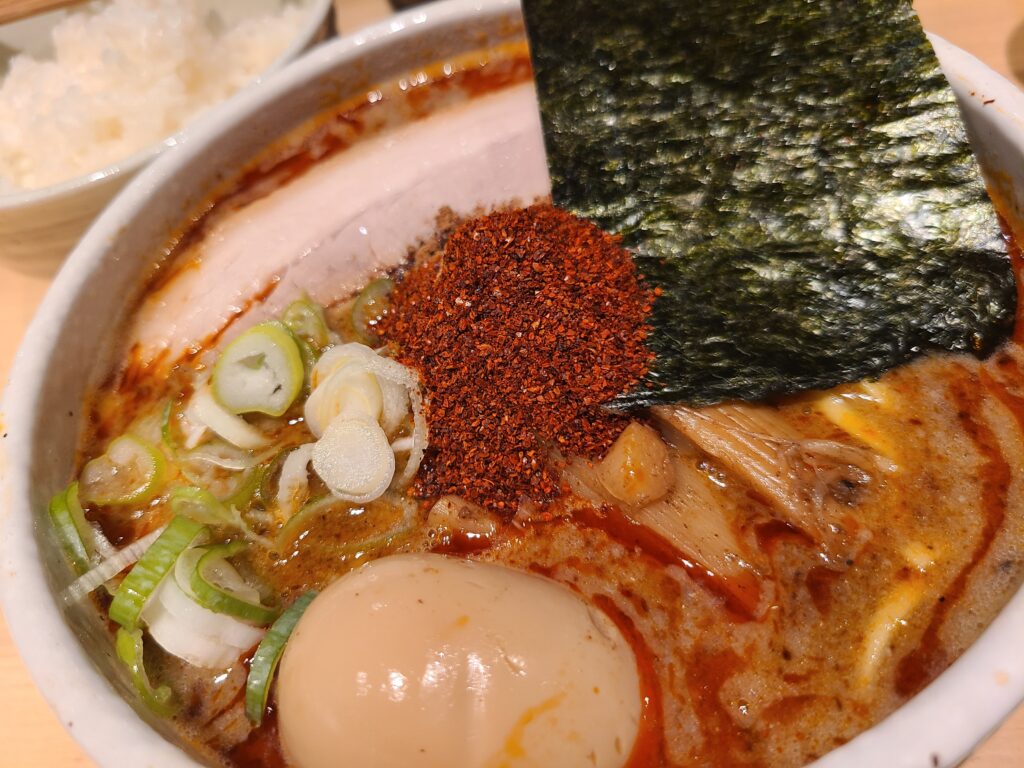 味玉辛辛魚ラーメン(1300円)(辛さ普通)とライス(180円)を頂きました。